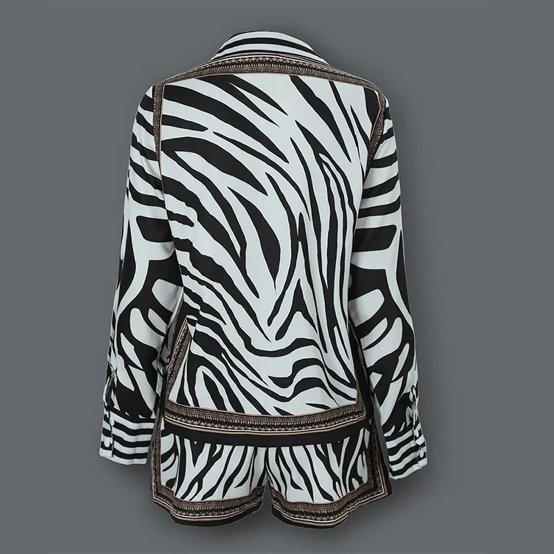 New Zebra Print Buttoned Shirts Zipper Short Sets Women's 2 Two Pieces Set Wide Leg Shorts Long Sleeve