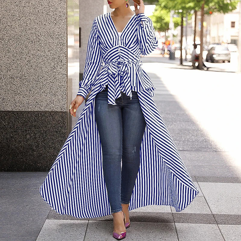 awesome Women 2020 Spring Fashion Casual Long Shirt Workwear Office Formal V-Neck Top Striped Tie Waist Dip