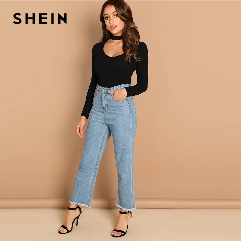SHEIN Black Workwear Elegant Scallop Trim Solid V Neck Long Sleeve Skinny Tee 2018 New Autumn Minimalist Women T shirt And Top,SHEIN White Crisscross Choker Neck Ribbed Knit Slim Fit Plain Top Stand Collar Party Tee Women 2019 Spring T-shirt Tops, SHEIN White Crisscross Choker Neck Ribbed Knit Slim Fit Plain Top Stand Collar Party Tee Women 2019 Spring T-shirt Tops