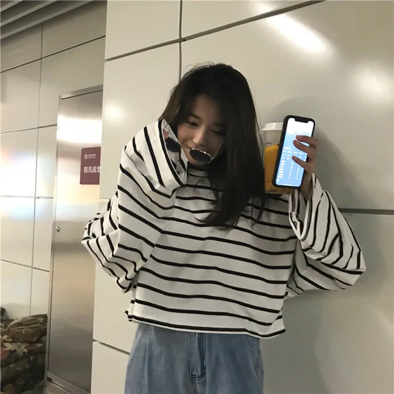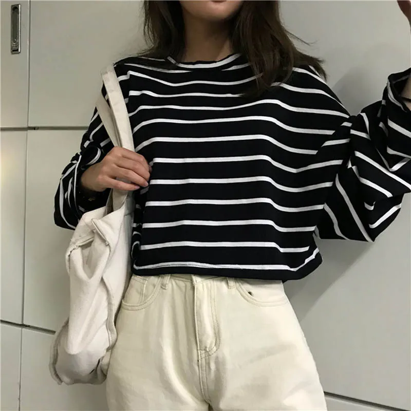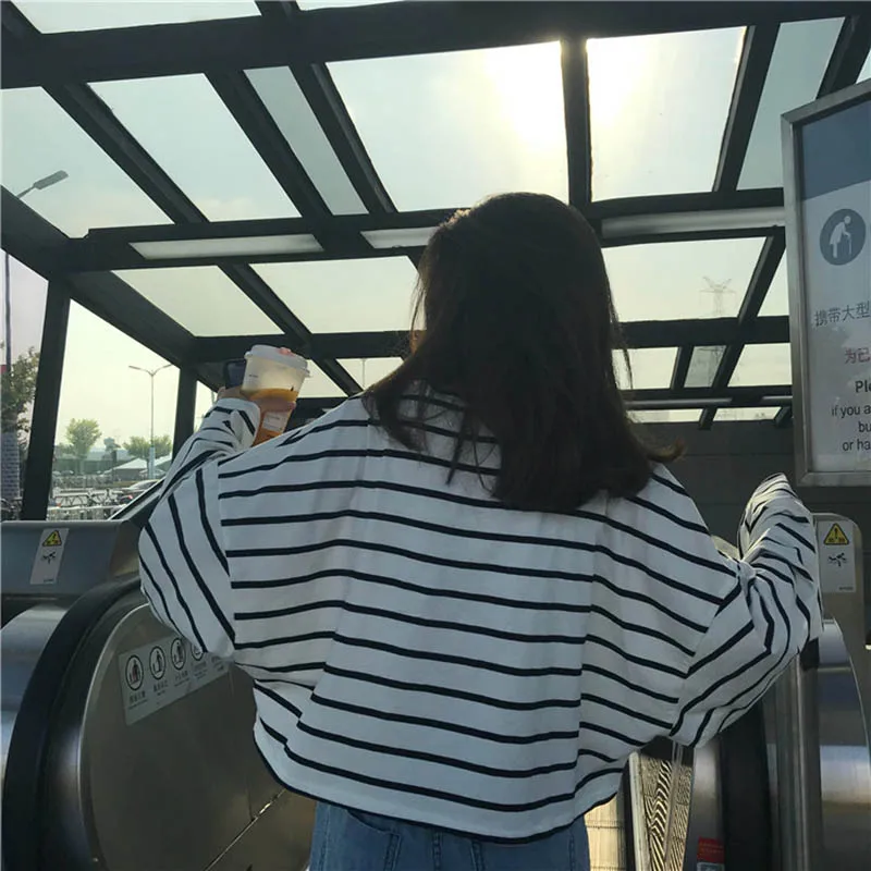 remarkable Striped Tshirts Women Summer Crop Tops Long Sleeve Harajuku Tee Shirt Casual Cropped Shirts Plus Si